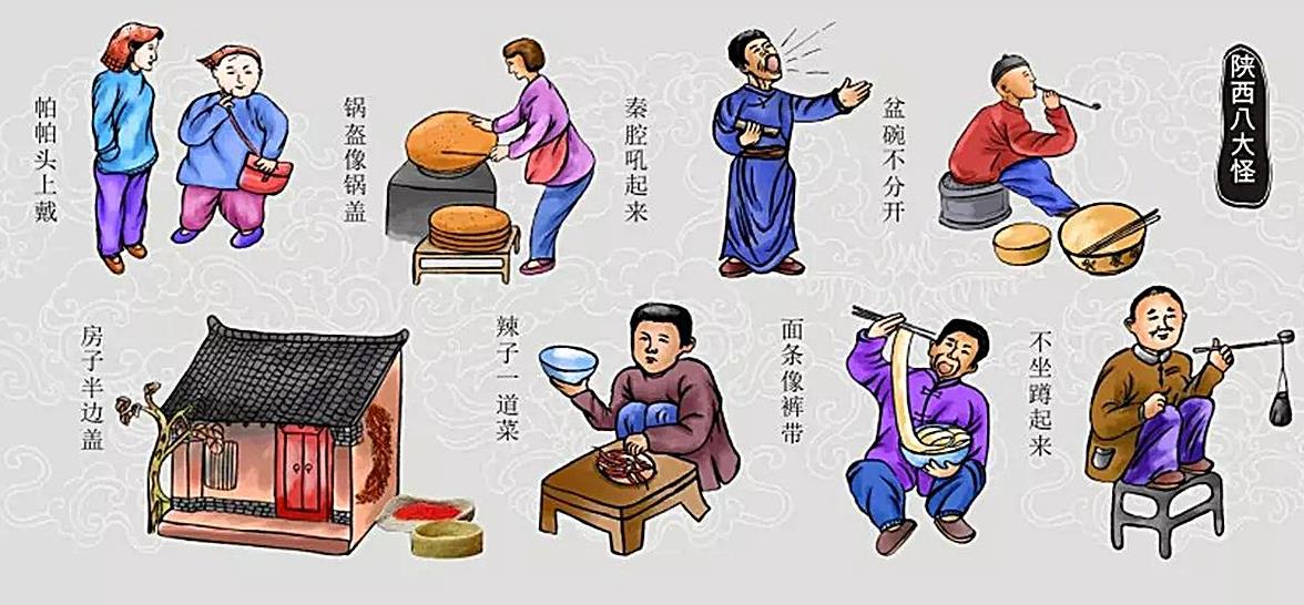 陕西八怪是指陕西省的关中地区(大致包括西安、宝鸡、咸阳、渭南、铜川,秦岭以北,黄土高原以南)出现的八种独特的汉族民风民俗。由于气候、经济、文化等多方面原因的影响,关中地区在衣、食、住、行、乐等方面,形成了一些独特的方式。有着丰厚历史文化积淀的陕西关中地区,沿袭历史民俗,形成了生动有趣“八大怪”,以其“古风古韵古长安”的独特魅力,成为外地游人探寻的一大热点。第一怪:板凳不坐蹲起来、第二怪:房子半边盖、第三怪:姑娘不对外、第四怪:帕帕头上戴、第五怪:面条像裤带、第六怪:锅盔像锅盖、第七怪:油泼辣子一道菜、第八怪:秦腔不唱吼起来!