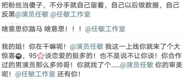 不论任敏微博发的是营业美照还是生活日常,总有粉丝在评论区 cue 她分手。" 什么时候分手呀宝 "、" 早日分手早日进组 "、" 专注自己爱自己 "、" 还是想说记得分手 "、" 智者不入爱河 "、" 很漂亮,所以什么时候分手,打算对粉丝一直装下去吗?"…
