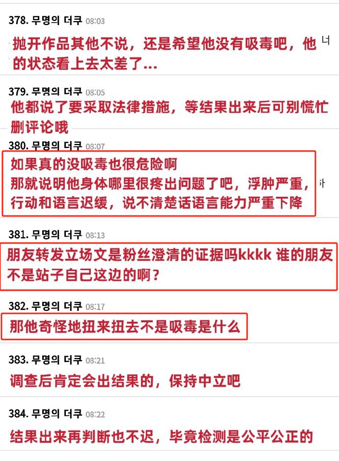韩国网友看到权志龙好友的力挺后,认为这并不能当做粉丝的澄清证据,称朋友都会选择站在自己这边。而且,权志龙的行为怪异是实打实的,假设真的没有吸毒,那说明他的身体状况也很危险,肉眼可见的浮肿,再加上行动和语言迟缓,状态实在太差。不过也还有一些网友始终保持中立态度,称检测公平公正,等待结果就可以,不要先审判。