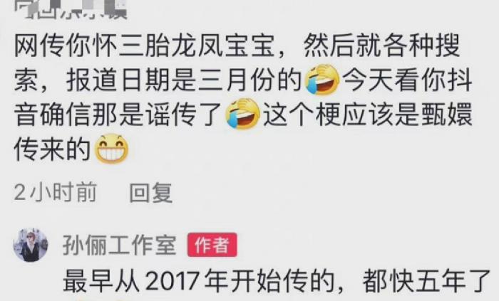 然而有趣的是,孙俪工作室在辟谣过程中,回复影迷粉丝的言论特别有趣,比如有人问老刷到孙俪怀上三胎的视频,是你不是真的?