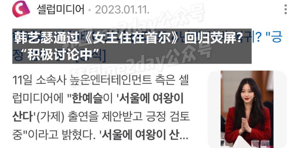 此前还传出了韩艺瑟成功选角电视剧《女王住在首尔》的消息,韩艺瑟将在《女王住在首尔》中饰演在业界被称为疯子的时尚杂志首席记者南达拉,剧中南达拉是拼命想要争取第一的成就主义者,她每天的生活都像战斗一样,但南达拉依旧以积极顽强的精神战胜了只属于自己的伤痛,并展现了热情的首尔土著的面貌。不过目前还没有任何关于《女王住在首尔》拍摄进度的消息,想念演员韩艺瑟了,期待欧尼早日回归啊!