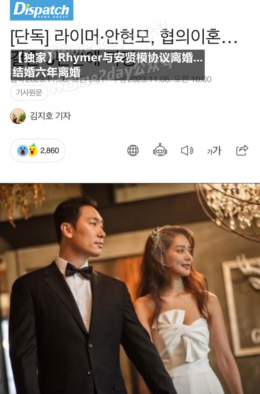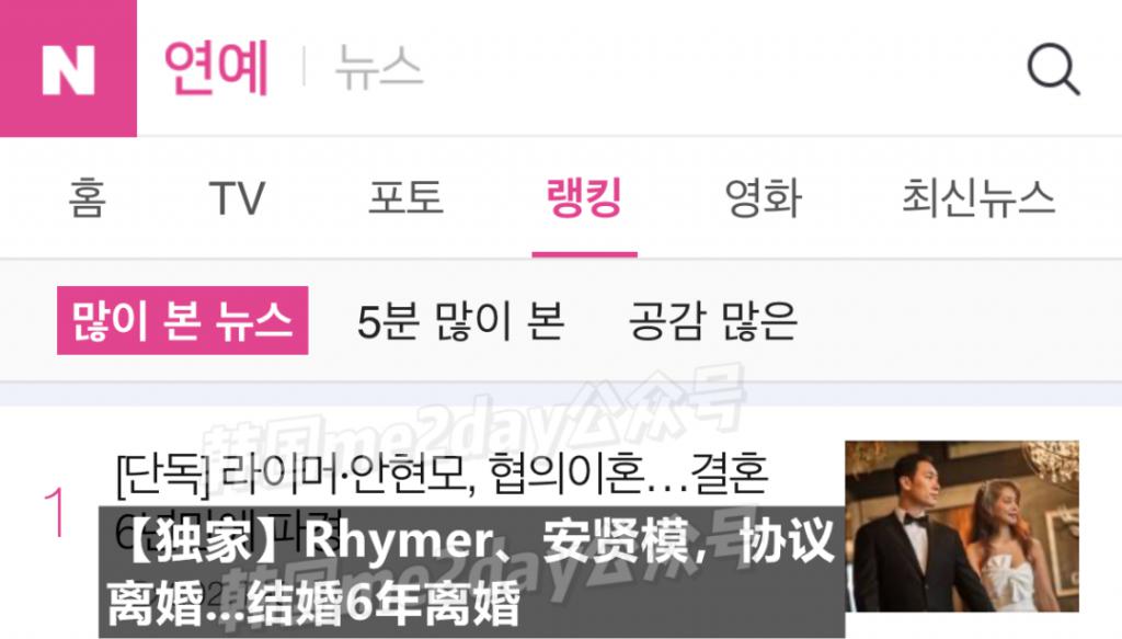 11 月 6 日据韩媒 Dispatch 独家报道,Rhymer 与安贤模结婚六年协议离婚,该新闻发出后立即登上了 NAVER 热门新闻排行榜一位。