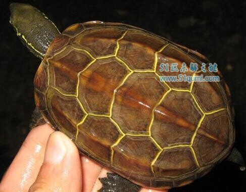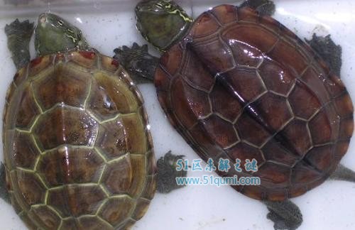 混淆的地方就是它们的背甲,小的时候都有一点很相同,那就是背甲上三条黑线,金线龟的是三条纵瘠,而金钱龟则不同,是三条黑线,三条黑线像个“川”字,好像用毛笔描过了一样清晰,所以也就得名三线闭壳龟。