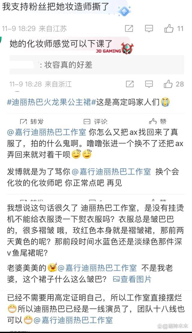 或许是因为热巴的现场状态不佳,惹怒一众粉丝,大家将这个问题怪罪给工作室和造型团队,直接涌入评论区进行差评。有的粉丝直接差评妆容,直言可以炒掉化妆师了。还有人不满意热巴的这身礼服,认为团队太不用心,没有选择匹配热巴咖位的高定,更重要的是,团队也没有处理好这身造型,不把裙子熨烫平整,竟然就让热巴直接穿着上场了。