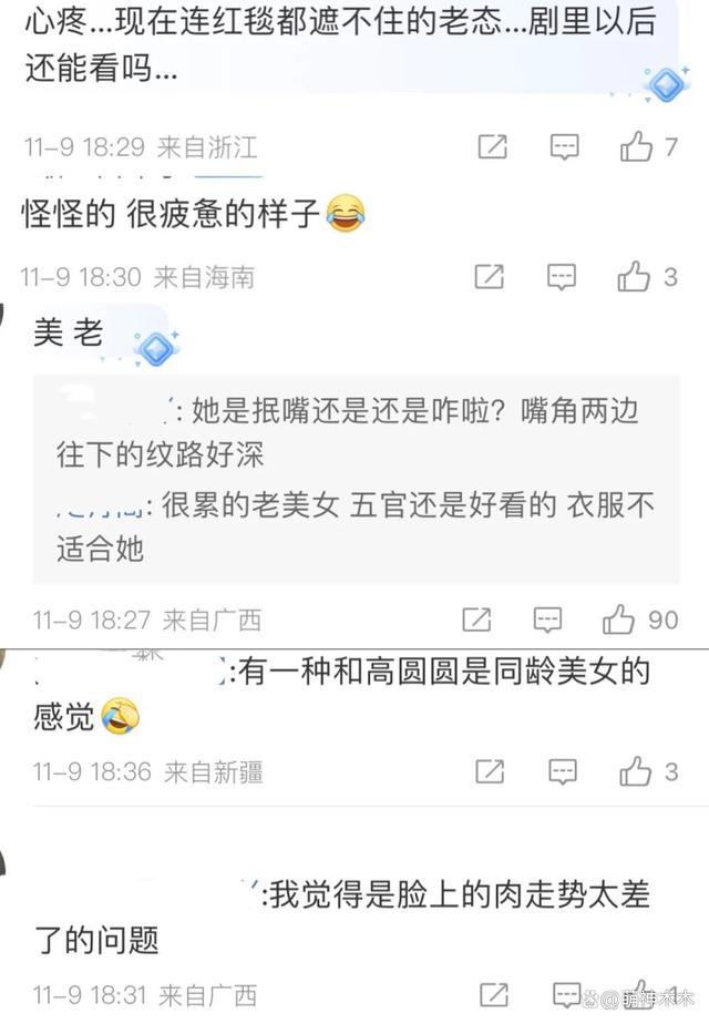 可是一旦卸下滤镜,热巴的颜值就暴露出诸多问题。首先是脸部的垂坠感,即便是扑着厚厚的粉底,也能清楚看到她的法令纹,还有脸腮处下垂的痕迹。这种脸部状态令热巴尽显疲态,加深了热巴的年龄感。特别是当她垂头抿嘴时,嘴角两边纹路更是随之加深,整体感觉老了十岁,甚至被网友吐槽称 92 年的热巴与 79 年的高圆圆看着就像同龄人。