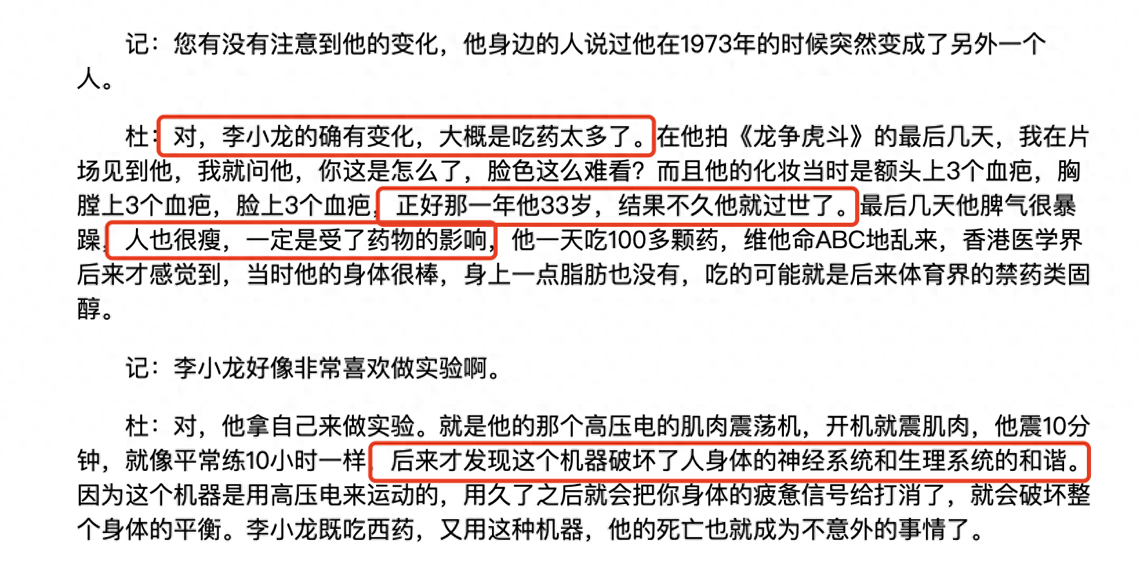 该记者还爆料称:“最后几天,李小龙脾气很暴躁,人也很瘦,一定是受了药物的影响,他一天吃100多颗药!”