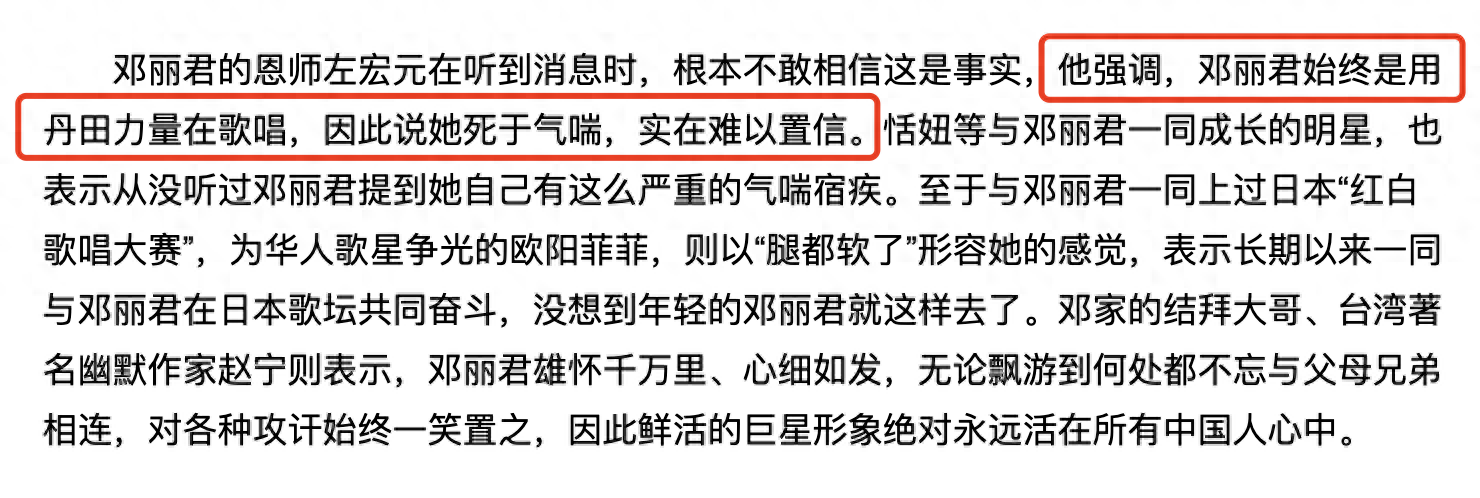 邓丽君的恩师左宏元,在听到该条消息时,根本不敢相信这是事实,他一再向媒体强调:“邓丽君始终是用丹田力量在歌唱,都说她死于气喘,实在令人难以置信。”