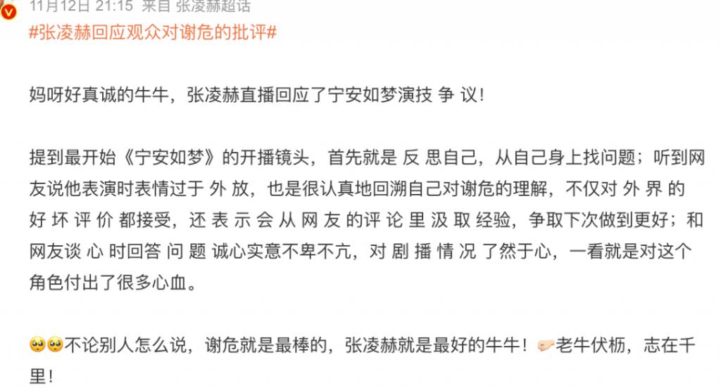 现在演技被痛批后,张凌赫也有回应,说开始质疑自己当时对谢危的理解,也在批评中看到了需要进步的地方——