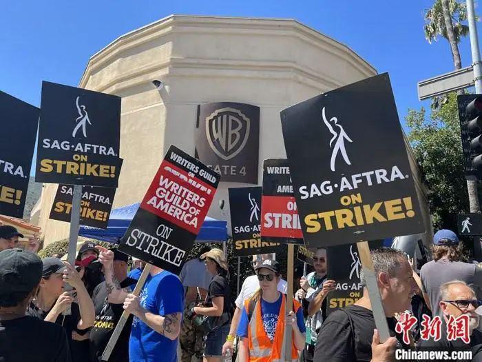 拥有约 16 万名会员的好莱坞三大工会之一美国影视演员协会 ( SAG-AFTRA ) 发起罢工,于 14 日起在洛杉矶和纽约的十余家制片公司外示威游行。中新社记者 张朔 摄