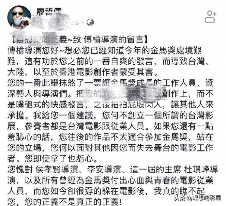 近日,台湾金马奖出现内讧,台湾电影人廖哲儒明显不满于金马奖的现状,在脸书上公开发文炮轰傅榆导演。