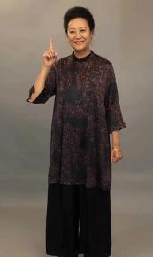 就如这件大花朵中式上衣,若是用上图左边的发型搭配,看着绝对会很土气。但当头发剪短气场一开,普通的老年装,就成了贵妇装。