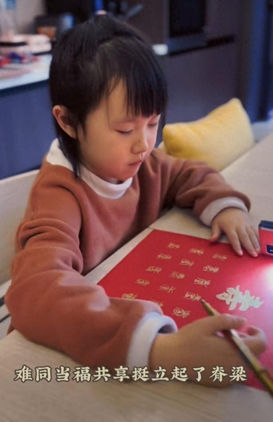 小朋友留着齐刘海,穿着棕色毛衣,端坐在书桌前,神情特别专注。她持笔练字的姿势很到位,从小就形成了良好的习惯,认真写字的模样十分可爱。