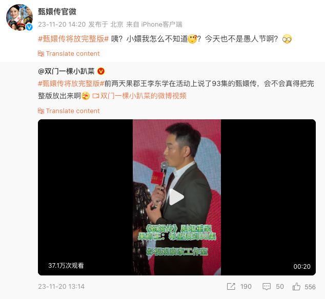 一位微博网友截取了一段视频,是果郡王扮演者在某活动现场上的一段话,里面说如果甄嬛传能出到 93 集的话,能解释果郡王为啥总不干活,这是一个巨大的惊喜。并配文前两天果郡王李东学在活动上说了 93 集的甄嬛传,会不会真的把完整版放出来啊。