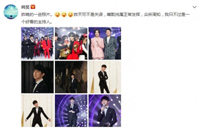 4月25日晚上,何炅在社交媒体晒出一组《歌手•当打之年》的现场照,并发文回应在节目中出现嘴瓢一事,将观众轰击节目组的炮火熄灭,他自嘲:“昨天可不是失误,嘴瓢纯属正常发挥,众所周知,我只不过是一个好看的主持人”。