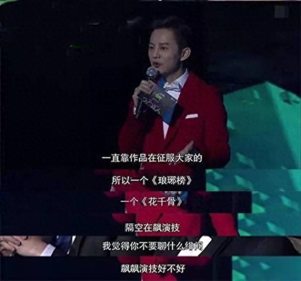 然后何炅在台上四两拨千斤帮忙圆场,几句话就把对绯闻的调侃拉回到演技上。