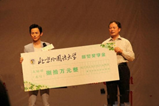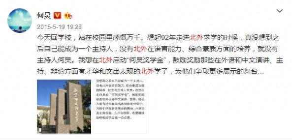 后来由于宣传活动回到“北外”的何炅,为了回馈母校的培养特意启动了“何炅奖学金”用以鼓励、奖励那些在外语和中文演讲、主持、辩论方面有才华和突出表现的北外学子。