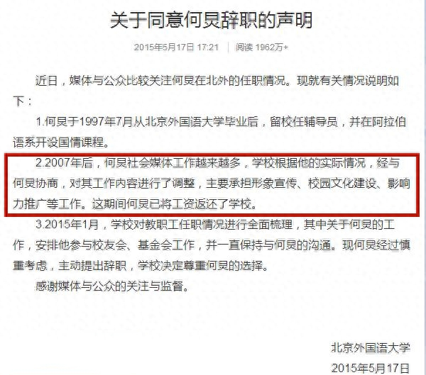 对于该争议“北外”在声明中调强,2007年因何炅社会媒体工作增加,与其协商之下,对其工作内容进行调整,主要承担形象宣传、校园文化建设、影响力推广等工作,这期间何炅已将工资返还了学校。