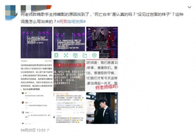 接着,有网友回顾节目时,发现何炅在直播中临场修改了许多台本中的不妥之处,反应极快地避免了说出打在提词器上的让选手尴尬的话以及将部分台词修饰得更加大气和谐。