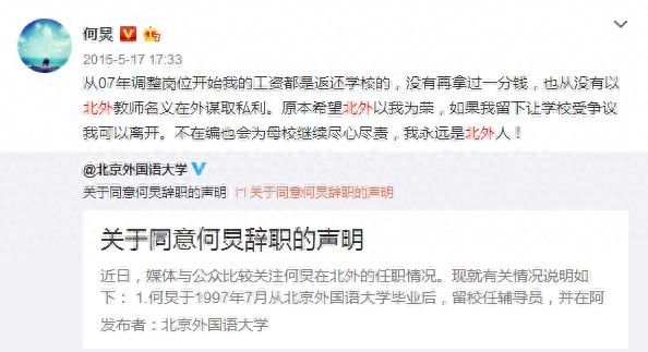 何炅在转发“北外”声明时也再次强调虽然辞职了,但永远是“北外”人,“从2007年调整岗位开始,我的工资都是返还学校的,没有再拿过一分钱,也从没有以‘北外’教师名义在外谋取私利。原本希望‘北外’以我为荣,如果我留下让学校受争议我可以离开。不在编也会为母校继续尽心尽责,我永远是‘北外’人”。