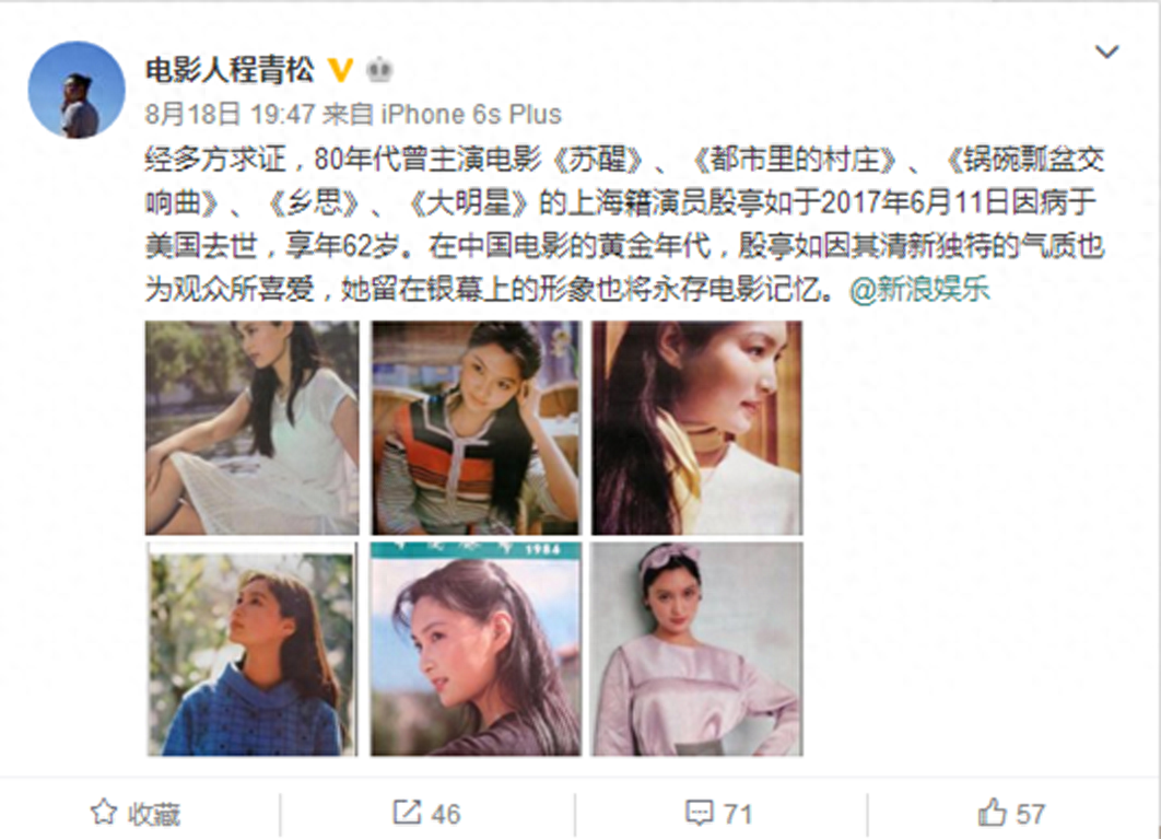 2017年6月11日,殷亭如在美国因病去世,不少影迷都为之惋惜。