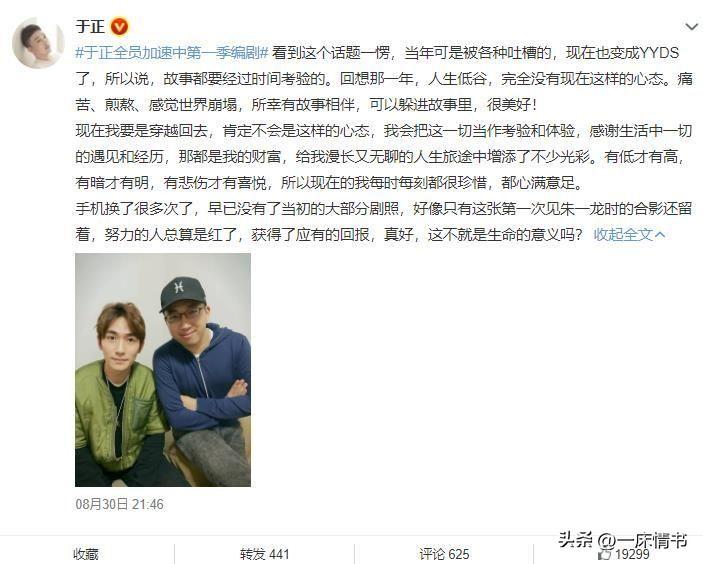 被网友拱上热搜后,于正发文分享了七年前当编剧时的感受,并且晒出第一次见到节目嘉宾朱一龙时的合照。