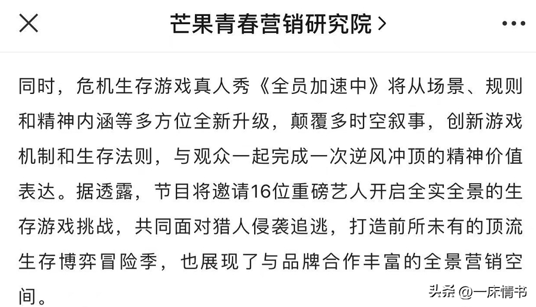 据一床情书了解,《全员加速中》每一期节目都设计主题故事,参与加速的明星嘉宾在规定时间和场地中,既要躲避黑衣猎人的追捕,又要尽力完成任务,获得胜利币。