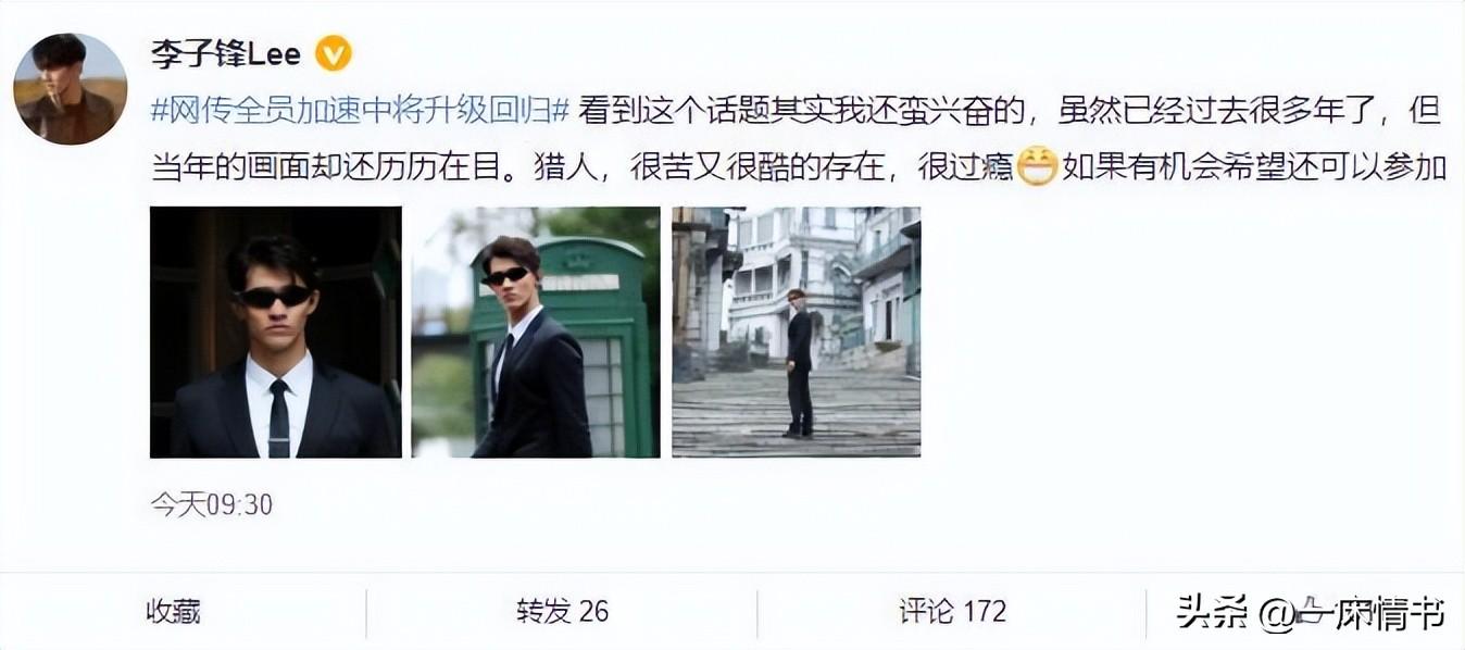听闻《全员加速中》即将升级回归后,他兴奋地发文,称“猎人,很酷又很酷,也很过瘾,如果有机会希望还可以参加。”