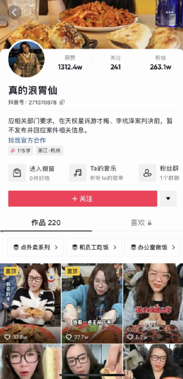在和“浪胃仙”IP创始人游絮撕破脸之前,仅抖音账号就有超3500万粉丝的浪胃仙,在以吃为主要流量来源、变现方式的“吃播”圈里绝对算得上是顶流。