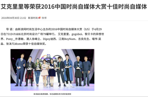 同年,艾克里里获得中国时尚十佳自媒体奖和移动视频风云盛典短视频人气榜样(网红)奖。