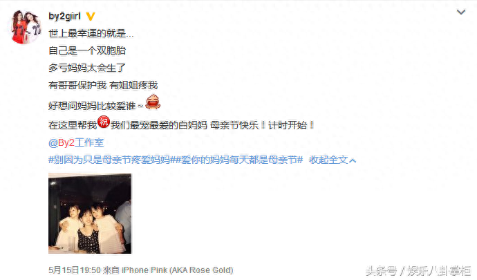 昨天晚上,人气音乐女子组合by2的官博在微博上给母亲送上了迟来的母亲节祝福,并晒出了两人童年时候和母亲的合照。配文:“世上最幸運的就是...自己是一个双胞胎,多亏妈妈太会生了,有哥哥保护我 有姐姐疼我,好想问妈妈比较爱谁~在这里帮我,我们最宠最爱的白妈妈 母亲节快乐!计时开始!”