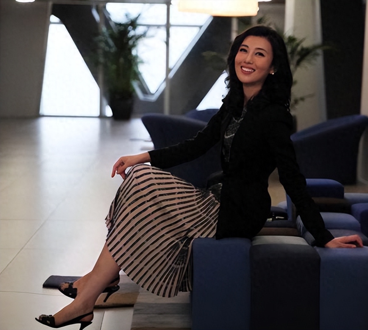 李红生活照,还是那个熟悉的发型,波浪内卷,挺拔的鼻梁,迷人又亲和的微笑,竖条纹中长裙搭配黑色高跟鞋凉鞋,外搭一件黑色中长西装,既有OL感但同时也不失流行感,端庄中带着一丝随意。