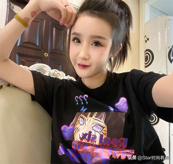 毕竟是一个网红,黑色的印花半袖,扎起来的高高马尾,精致的五官,只不过这一直没有变过的一字眉,也是大美的辨识标志之一,只是这发际线也是和小编一样堪忧啊,大家一定要保护好自己的发际线!