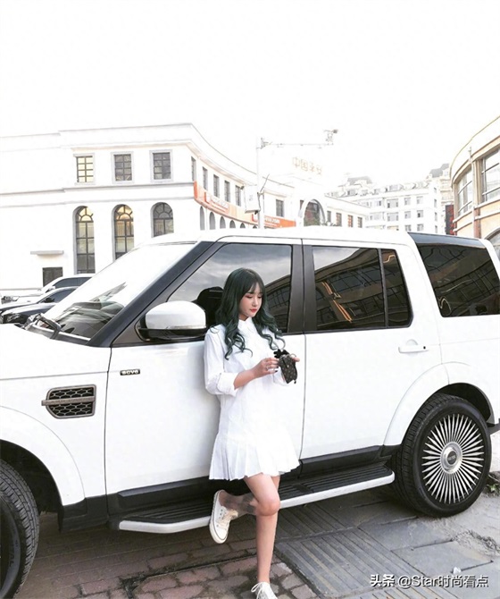 白色的衬衫长裙,POLO衫的衣领可以修饰脸部轮廓,裙摆的设计师荷叶边的设计,又增加了少女感,而帆布鞋的搭配,简直就是少女一枚,如果不是偏绿色的发色,还以为就是一个学生党呢。
