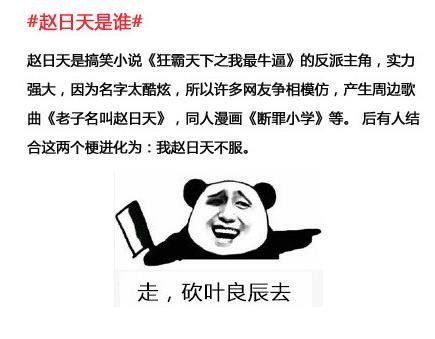 赵日天网络虚构人物,来源于ACfun的一个神串。李杀神、王诛魔和刘斩仙三位少年做梦也没有想到会在狼牙区飞虎路私立断罪小学再度聚首,面对校园里号称屠遍三界的“魔神”,四年级的赵日天。赵日天其实在2014年级已经红遍网络,在2015年国民老公王思聪又带了一波节奏,于是赵日天就开始了他的“不服”之路。