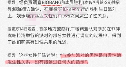而据昨日韩媒报道,韩国警方也已经确认了胜利在菲律宾举行的生日派对中,男性嘉宾和从事娱乐场所的从业女性发生了性关系,不过根据警方对部分女性的调查,她们虽然承认发生了性关系,但是却表示所有行为都是自愿的,也没有收到任何性招待的只是。所谓关于胜利为性交易中介这个嫌疑始终未能有进一步的石锤。