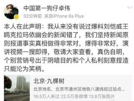卓伟不止一次说过刘恺威王鸥深夜幽会是事实。