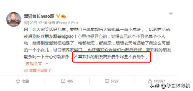 6月20日,“GIAO”哥发微博称,在活动时听到粉丝喊“GIAOGIAO”他感到知足,虽然自己是个小丑,但也算个小人物,希望观众老爷行行好,不喜欢他的朋友不要动手。