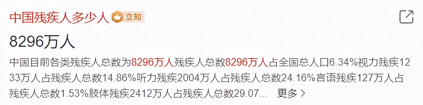 然而事实是:早在2018年,中国目前的残疾人数量,就高达8296万人,直逼1亿人。