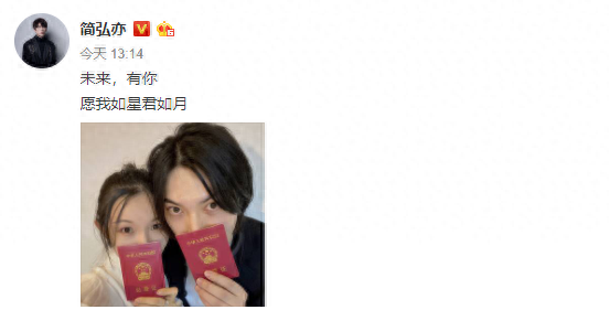 12月30日中午,简弘亦在个人社交平台上晒出了自己和妻子手举结婚证的自拍照,并配文"未来,有你,愿我如星君如月",宣布结婚。