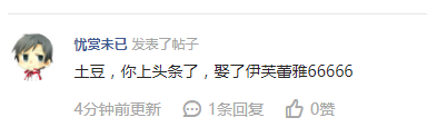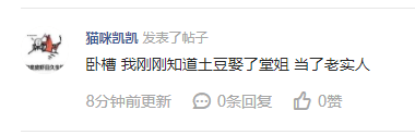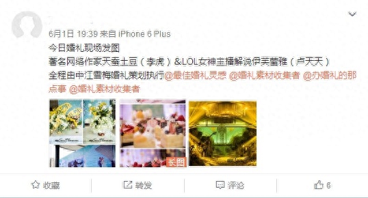 两个人的结婚真的是谁也没有想到的,连他们怎么认识都没有一个顺理成章的理由,而他们也是够低调的,伊芙蕾雅结婚当天的微博居然是“陪着侄女看儿童节晚会”,天蚕土豆则是什么都没发,连《大主宰》都没更新。而爆出他们结婚消息的那个人,也在发出不久就删除了微博。我想大概两个人毕竟都作为公众人物,实在不想因为这个劲爆消息影响他们的事业吧。