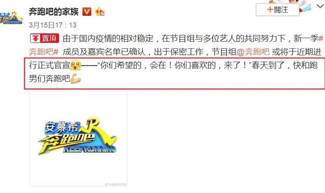 而近日跑男的官方微博账号奔跑吧的家族也是更新了微博动态,对于第八季跑男的录制。官宣了新的消息,表示因为国内疫情已经相对稳定,所以跑男已经正式开始录制,新一季奔跑吧的常驻嘉宾以及每一期邀请的成员名单已经确认,在后面一段时间会陆陆续续的进行正式的官宣,而最让人激动的就是,这个账号最后面的一句话,他表示,你们希望的会在你们喜欢的来了,这也让很多粉丝心潮澎湃,满怀期待。