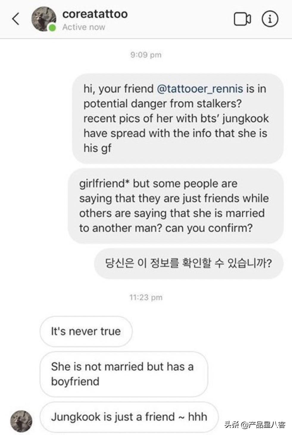 粉丝们通过向纹身店主私信确认,也证实被拍到的女生并没有与田柾国交往。女生也亲自在自己的ins发帖否认绯闻,表示“现在乱传的谣言和说是我引起误会的状况很难过才发帖”,并澄清自己与田柾国“只是认识的朋友的程度”,否认了诸如田柾国用女生首字母纹身、恋人关系等谣言,女生表示“因为这些事对我和我身边的人造成了很大的伤害,也对粉丝们造成了很大的伤害”。