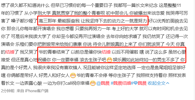 有粉丝动情写道,自己高三坚持下去的动力就是来源于偶像。祝福偶像爱情婚姻美满的同时的还不忘催生孩子。