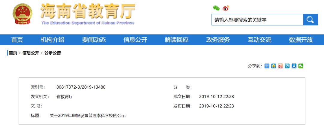 10月12日,海南省教育厅公布了一份《关于2019年申报设置普通本科学校的公示》。