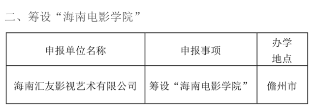 其中,海南汇友影视艺术有限公司申报筹设“海南电影学院”,办学地点在儋州市。