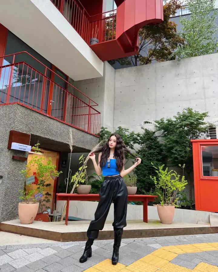 图中的这套蓝色鱼骨上衣和黑皮裤均来自 ZARA ▽