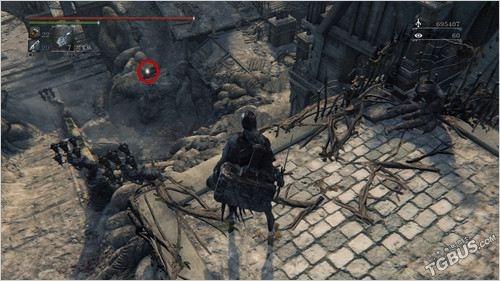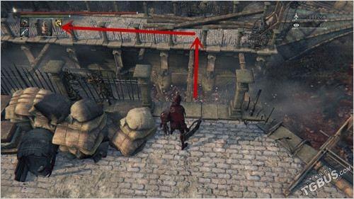 ≯之后我门跳下去,在爬一次梯子,上去后,最右侧还有一个大的缺口,切记,这里跳下去靠近里面可拾取物时,右侧有一个猎人,我的建议是直接拿到武器就跑,这里是一把右手武器怪兽猎人的弯刀,这里杀死这名猎人极大几率掉的是血药;