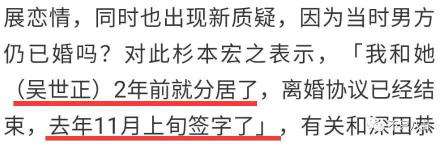 杉本宏之自曝与吴世贞于 2018 年 11 月上旬签订了离婚协议,而这正是坊间流传的他与深田恭子相识的时间。