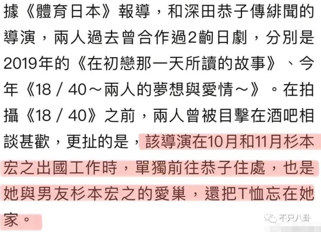 据日媒报道称,上月底,杉本宏之出差到纽约工作,导演 A 前往深田恭子家中过夜,还将自己的 T 恤遗落在深恭家中。