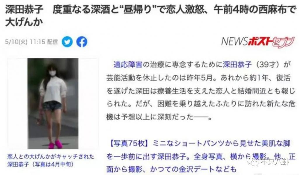 日媒《女性 SEVEN》报道称,深田恭子经常喝酒喝到作息混乱,夜不归宿。